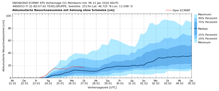Neuschneeprognose für die Texelgruppe auf 2517 m. (Quelle: Geosphere Austria)