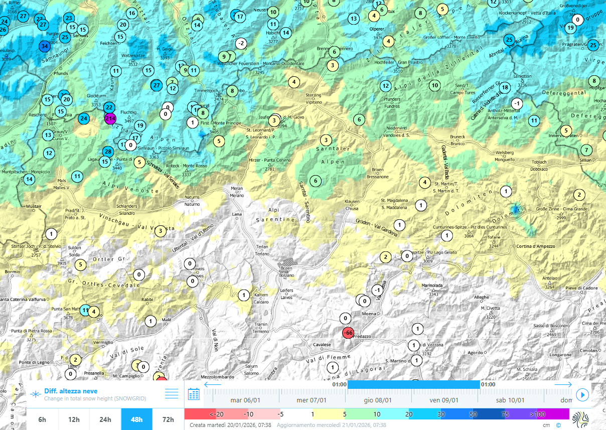 Schneehöhendifferenz zwischen Samstag 10.01.2026, 1:00 Uhr und Donnerstag 8.01.2026 1:00 Uhr. (Fonte: Geosphere Austria)