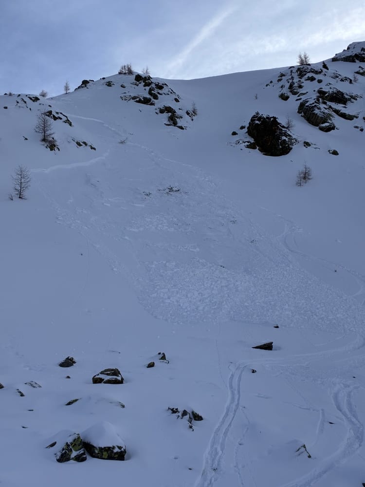 In der Nähe des Äußeren Nockenkopfes in Rojen wurden diese kleineren Schneebrettlawinen in nordwest exponiertem Gelände fernausgelöst. (Foto: Pierre Kirschbaum, 15.01.2026)Foto des Hanges 30 Minuten vorher. Die Geländerücken sind abgeblasen, für das geschulte Auge sind die Triebschneeablagerungen und Windzeichen erkennbar. Im Aufstieg wurden viele Setzungsgeräusche (Whumm) wahrgenommen. (Foto: Pierre Kirschbaum, 15.01.2026)Eine kleine Schneebrettlawine in einem Schattenhang wurde uns auch aus von der Henne in Weißenbach im Ahrntal gemeldet. (Foto: Simon Messner, 17.01.2026)