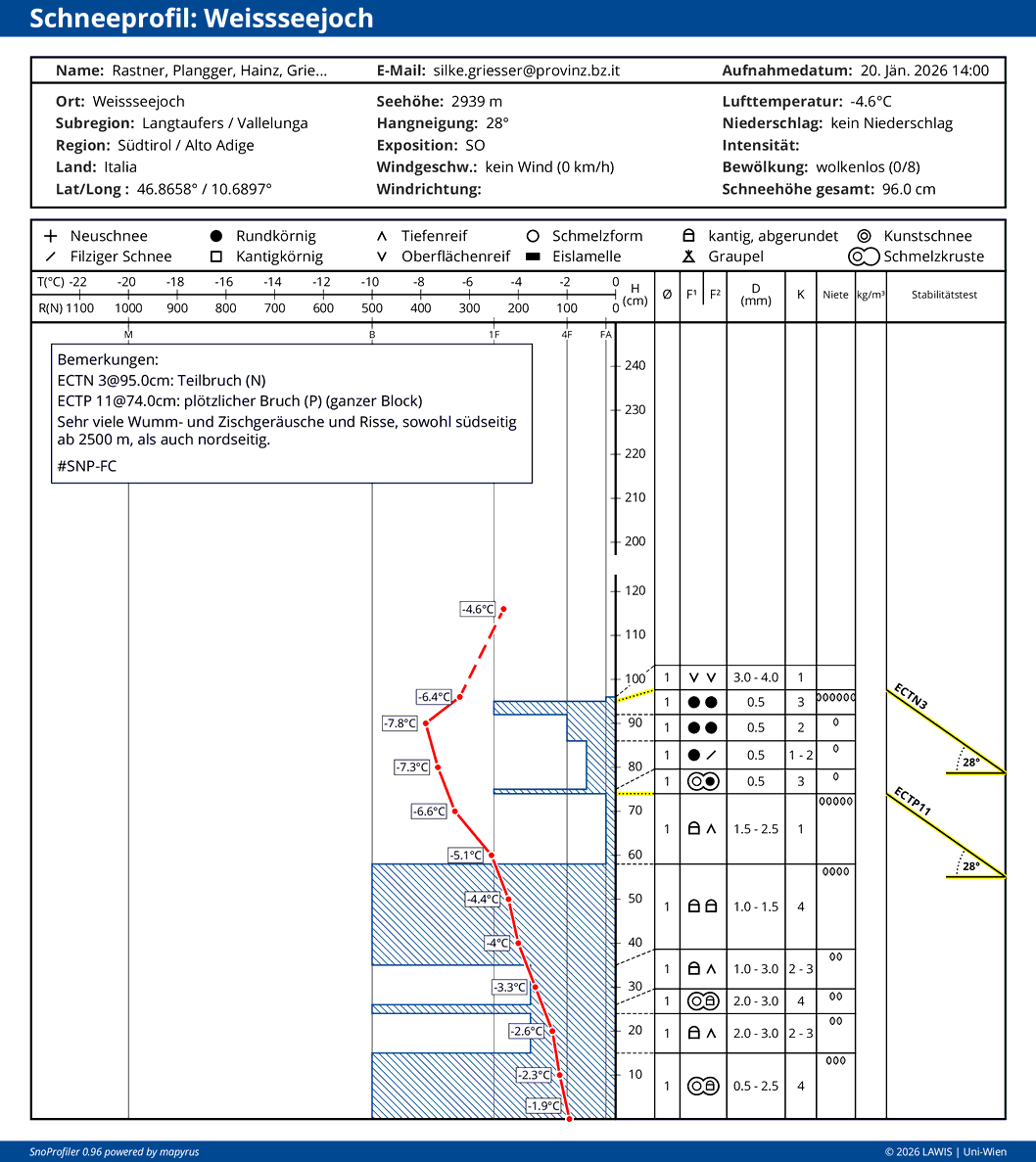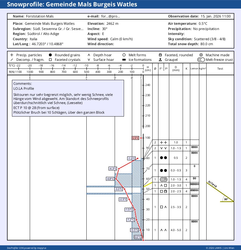 Schneedeckenuntersuchung auf dem Watles in der Sesvenna Gruppe auf 2460 m in einem nach Osten exponierten Hang. Die Schneehöhe ist überdurchschnittlich, da im Windschatten gegraben wurde. Die Basis der Schneedecke besteht aus großen Becherkristallen und ist schwach. An der Oberfläche findet man Triebschnee aus kleinen runden Kristallen, der auf einer Schwachschicht aus Becherkristallen und kantigen Kristallen lagert. Beim Stabilitätstest ECT konnte beim 10. Schlag ein Bruch mit Fortpflanzung initiiert werden. Dies bestätigt den schwachen Schneedeckenaufbau und die Störungsanfälligkeit der Schneedecke. An der Oberfläche findet man etwas Neuschnee und Oberflächenreif, dieser könnte nach den nächsten Schneefälleneine Schwachschicht darstellen. (Quelle: Forststation Mals, 15.01.2026)Auch in einem der Sonne exponierten Südwesthang trifft man auf eine ähnliche Situation mit einem schwachen Schneedeckenaufbau. In der Schneedeckenbasis findet man eine Abfolge von Schmelzharschkrusten und Schichten aus kantig abgerundeten Kristallen sowie Becherkristallen. An der Oberfläche lagert auch hier Triebschnee auf einer weichen Schicht aus kantig abgerundeten Kristallen und Becherkristallen. Beim Stabilitätstest wurde ein beim 11. Schlag ein Bruch initiiert und fortgepflanzt (ECTP). (Quelle: Lawinenwarndienst Südtirol, 20.01.2026))