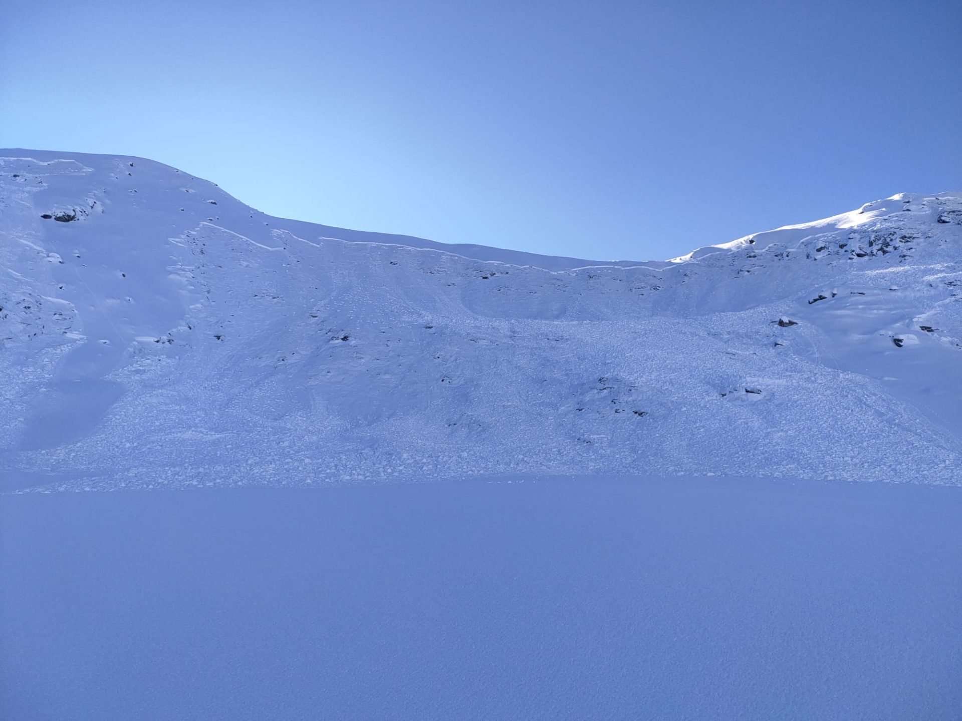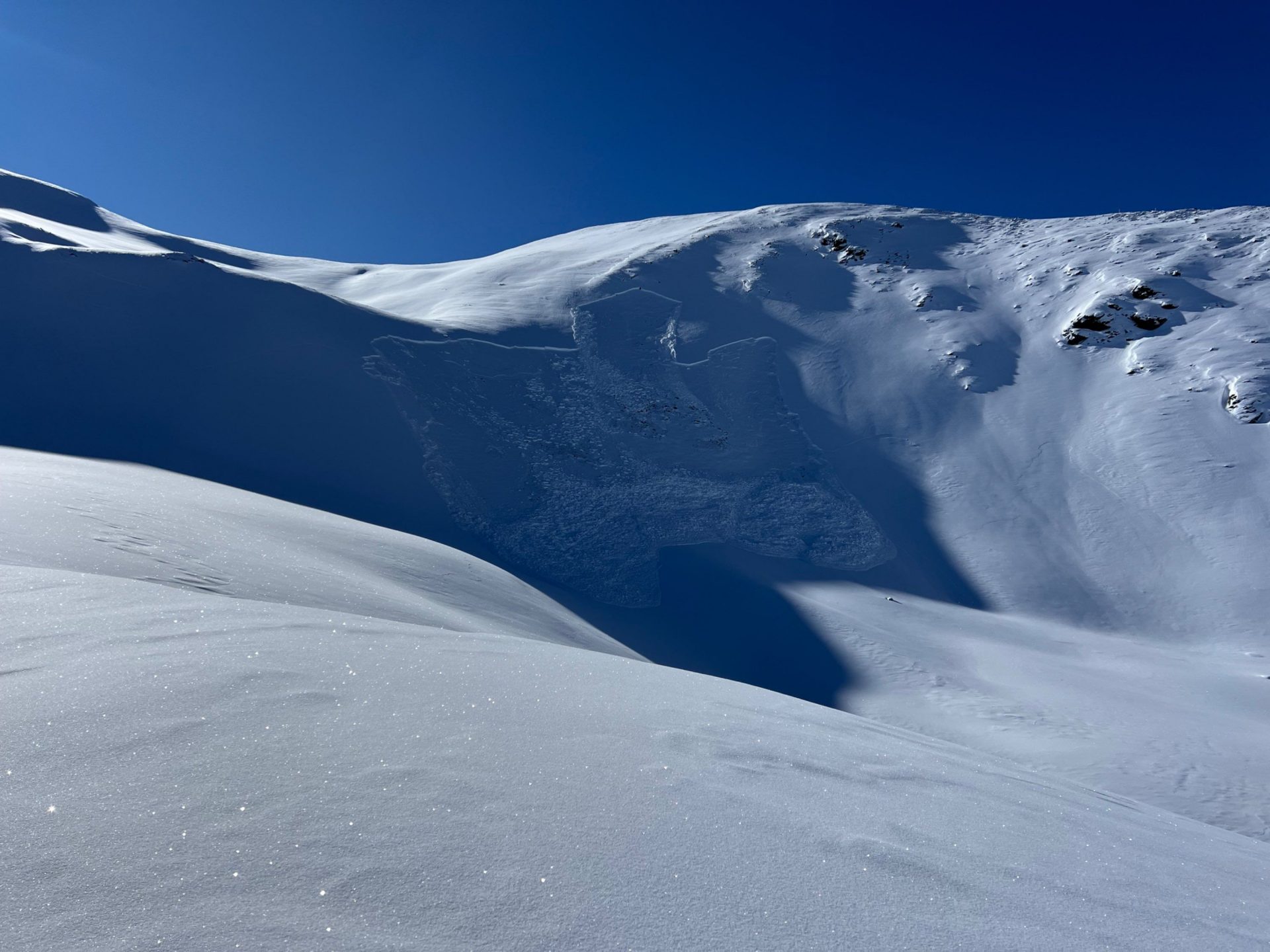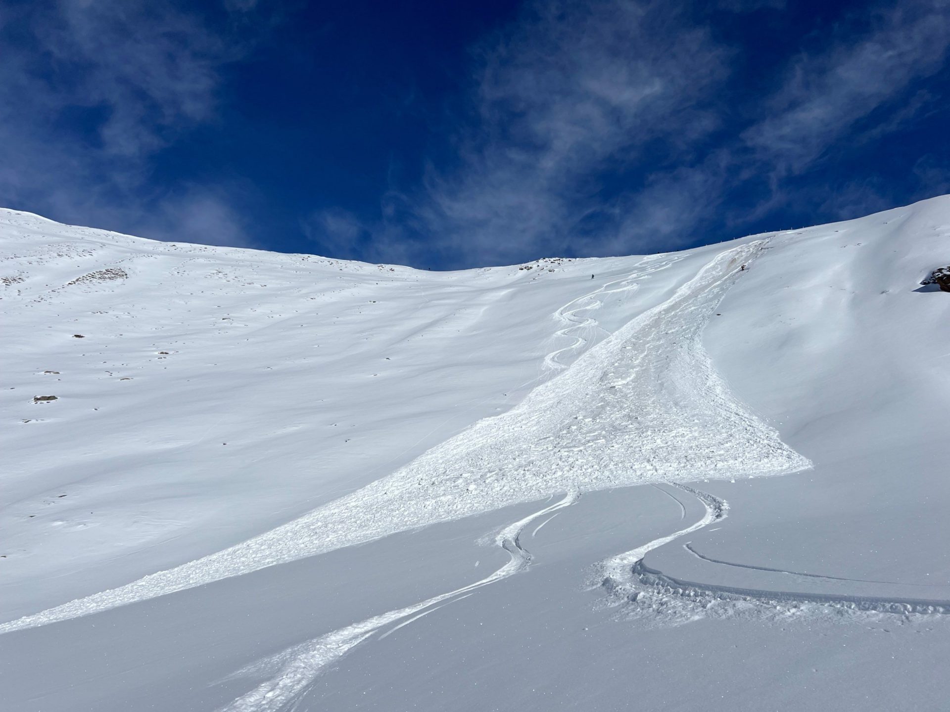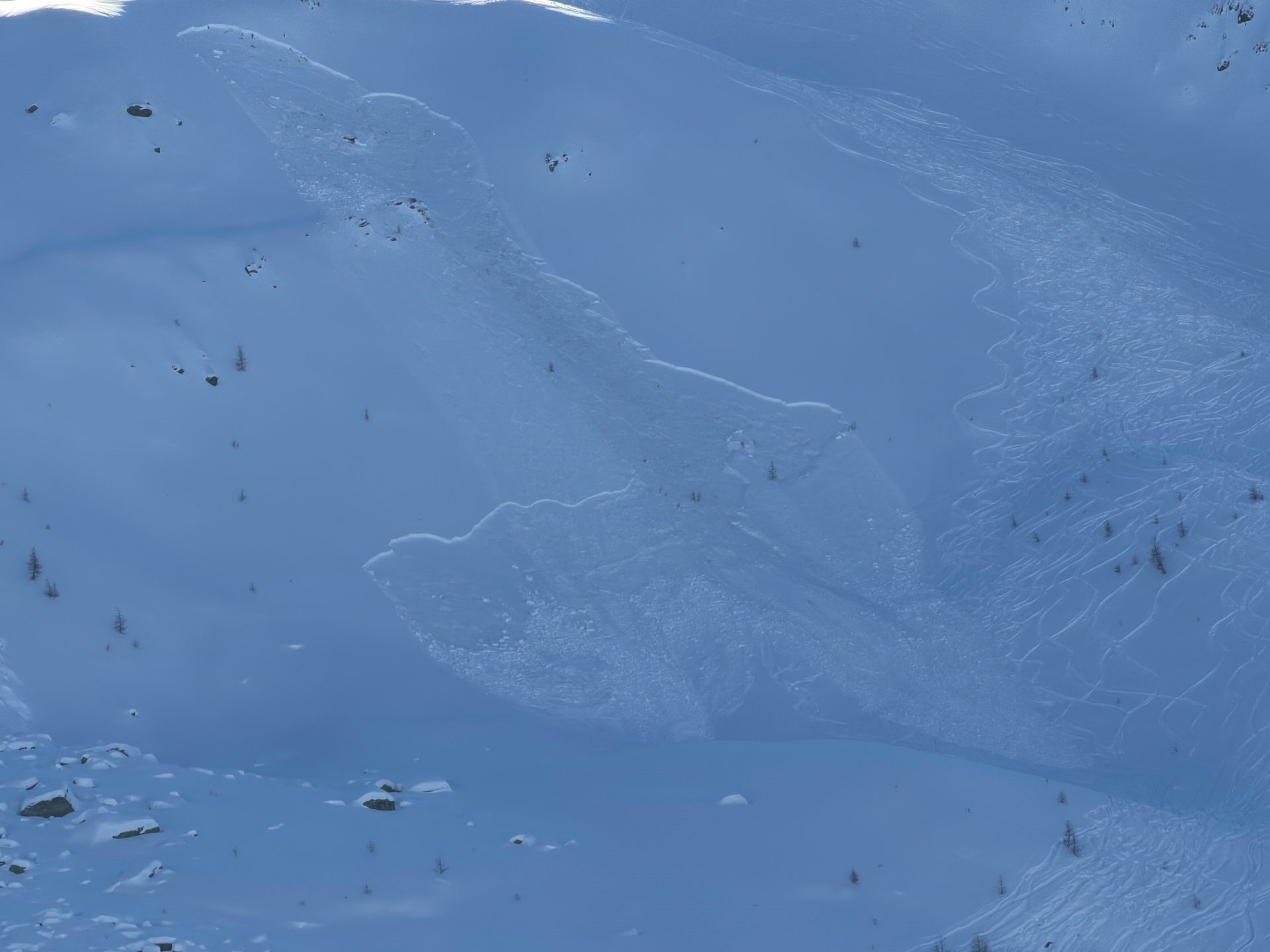 Es handelt sich um eine kleine bis mittlere Lawine. Sie ist auf ca. 2500 m in einem ca. 35° steilen Hang angebrochen.