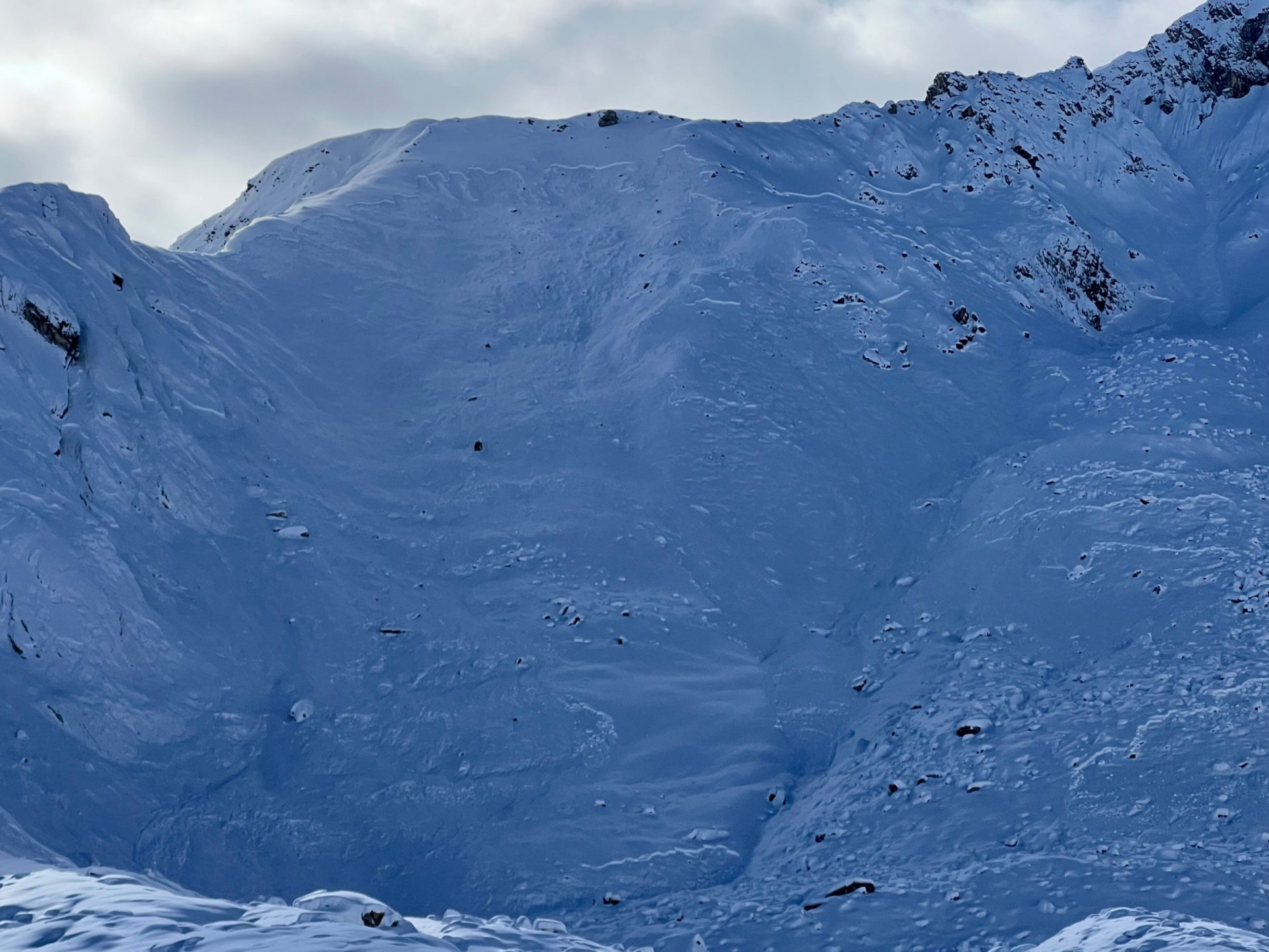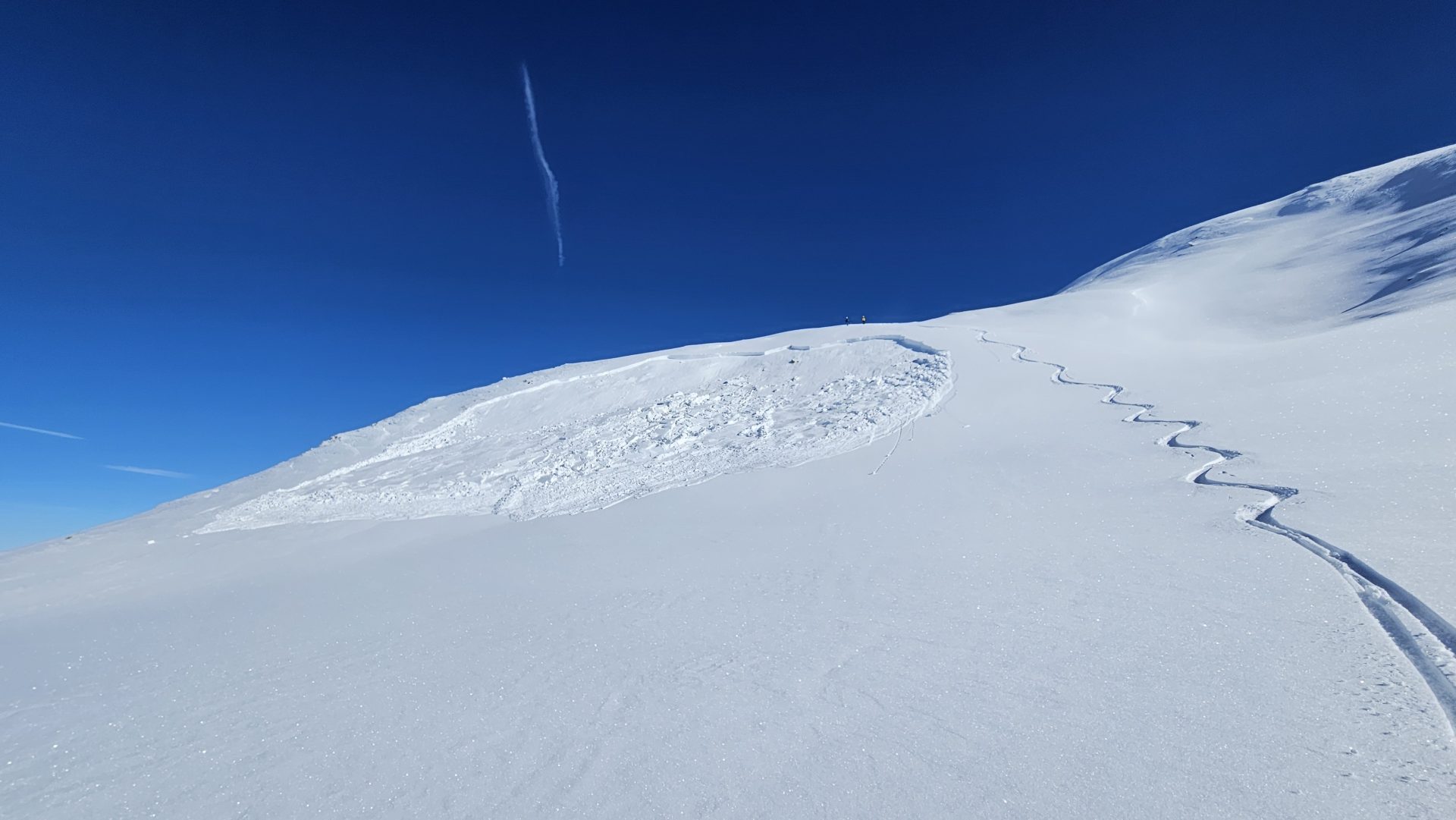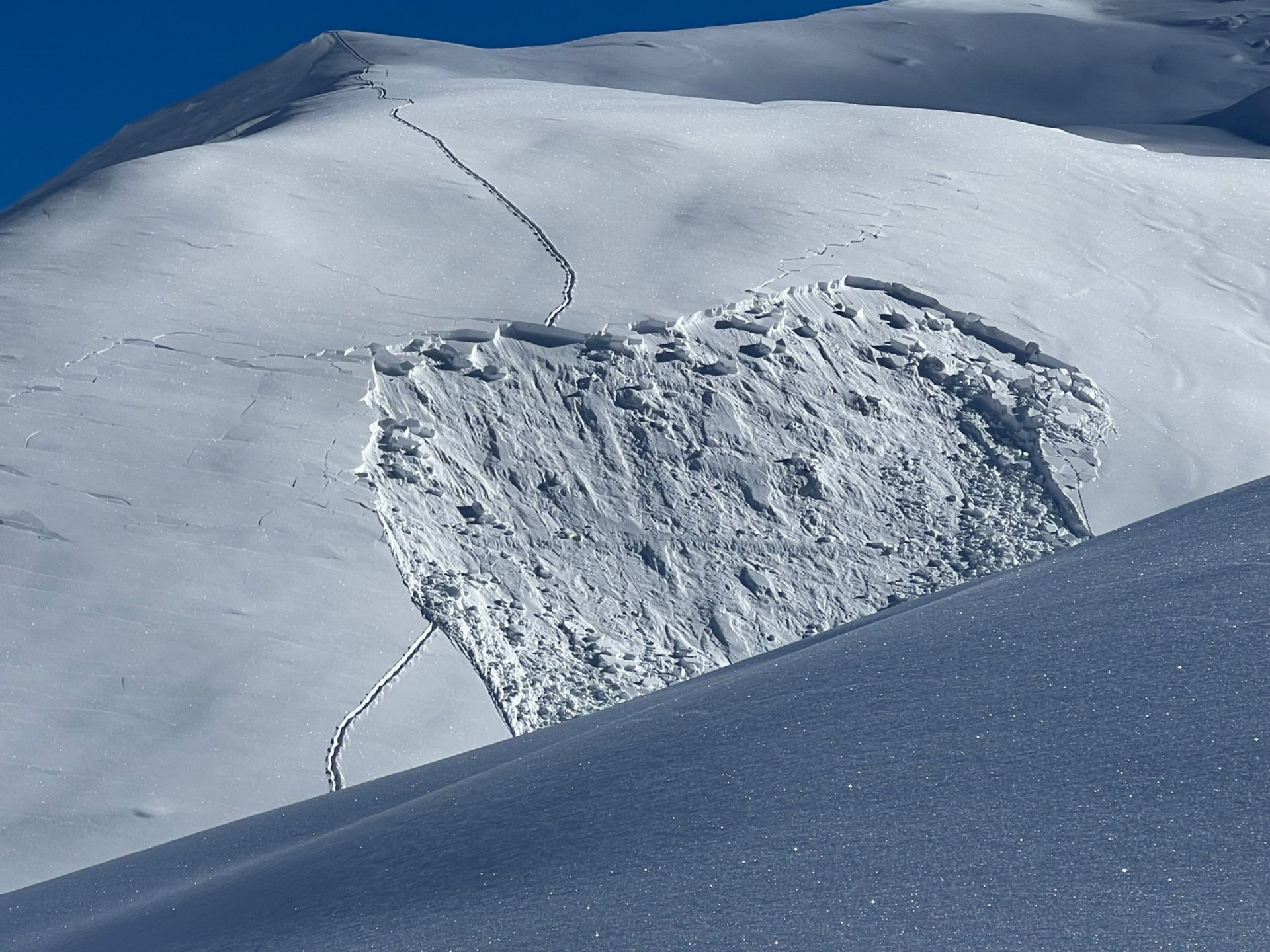 Es handelt sich um eine kleine bis mittlere Lawine. Sie ist auf ca. 2500 m in einem ca. 35° steilen Hang angebrochen.