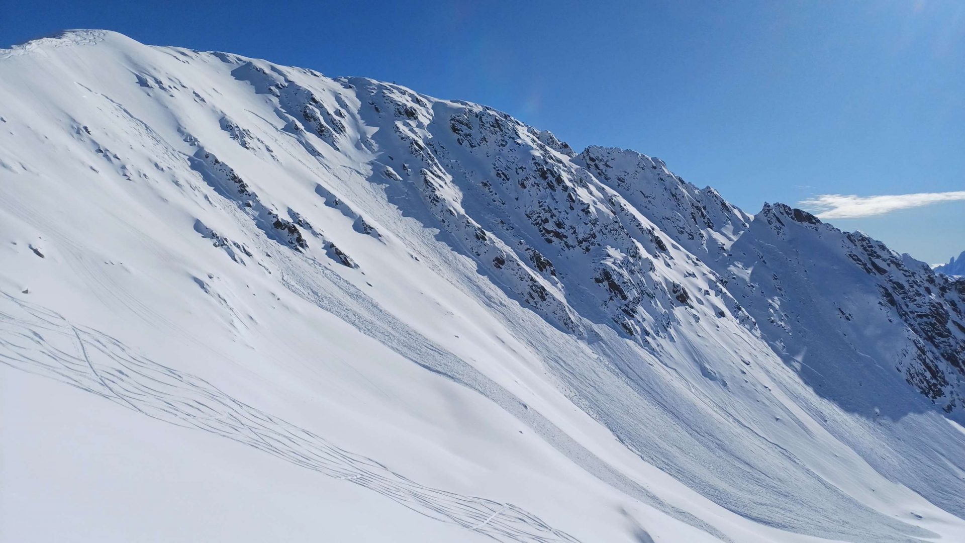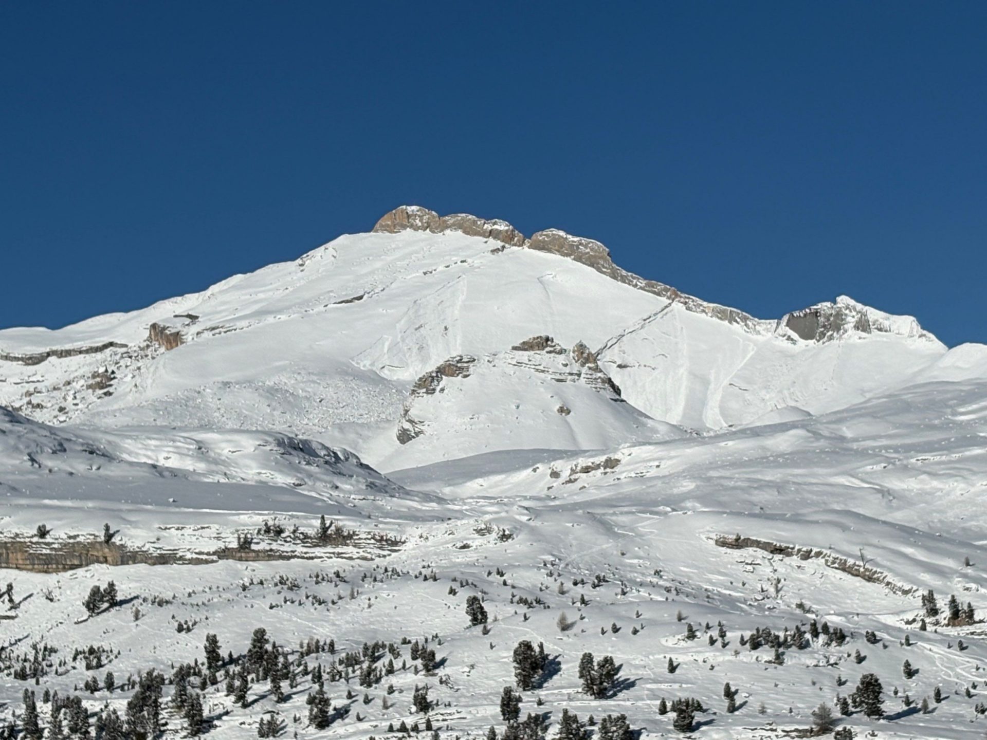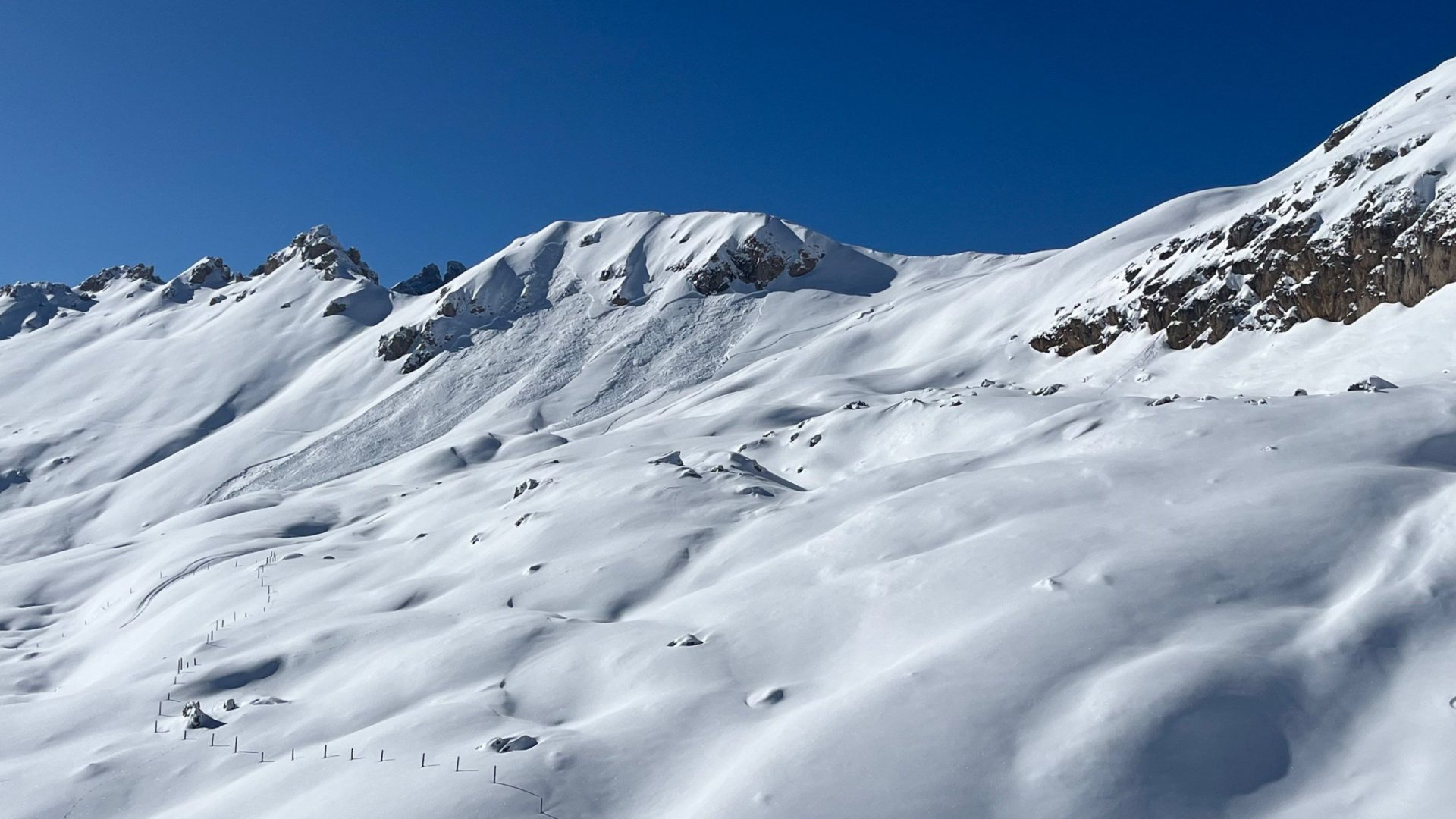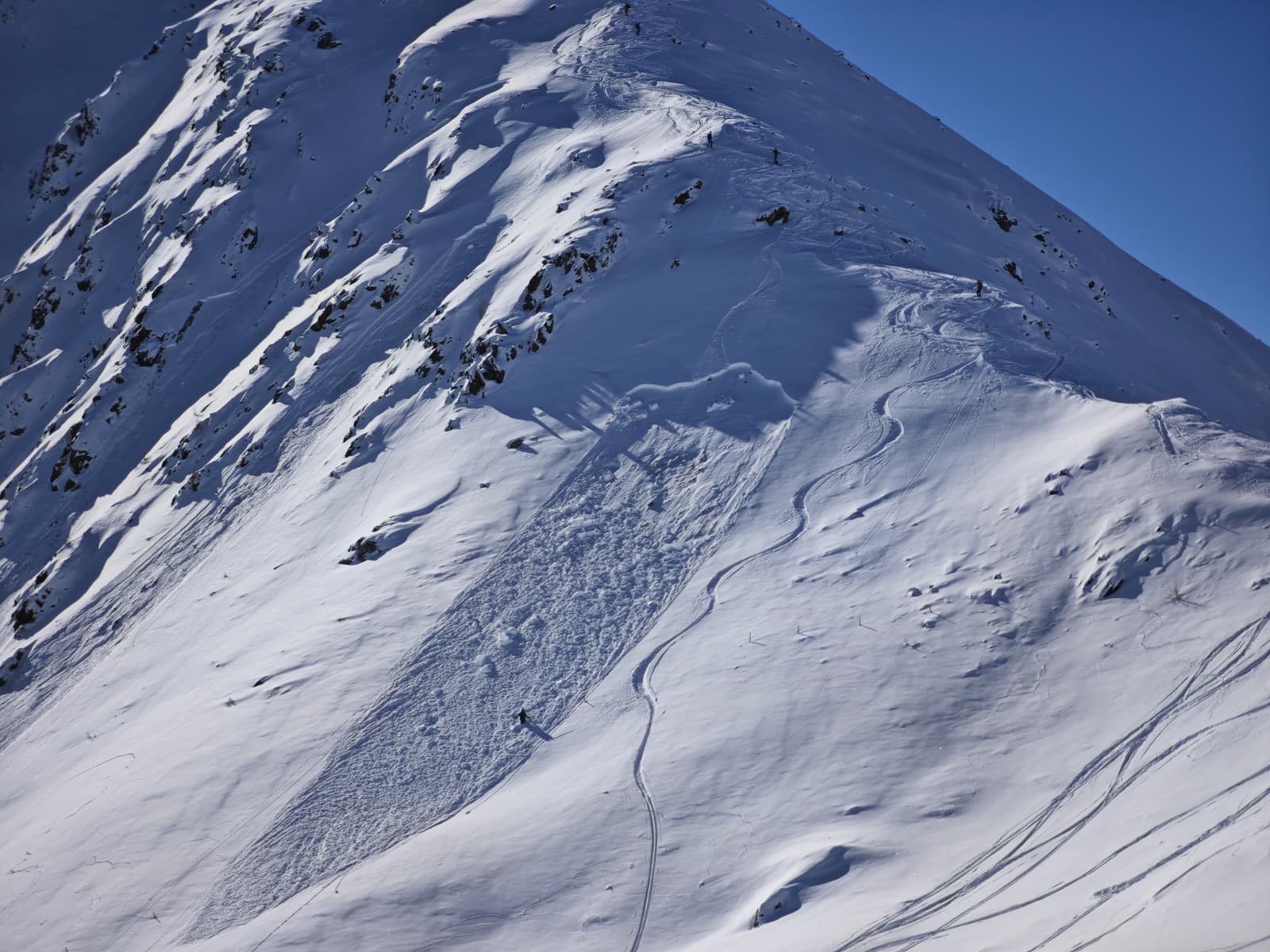 Es handelt sich um eine kleine bis mittlere Lawine. Sie ist auf ca. 2500 m in einem ca. 35° steilen Hang angebrochen.
