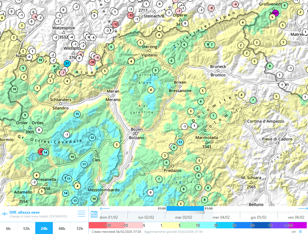 In den kommenden Stunden und in der folgenden Nacht kommt es neuerlich zu Schneefällen. Verbreitet werden 10 -20 cm Schnee erwartet: Am wenigsten im oberen Vinschgau mit nur wenigen Zentimetern, Richtung Sextner Dolomiten kann aber auch bis zu 40 cm Neuschnee zusammen kommen. Damit steigt in diesen Gebieten die Lawinengefahr auf Stufe 4 - groß an. Der Wind weht dabei meist nur schwach bis mäßig aus südöstlichen Richtungen.