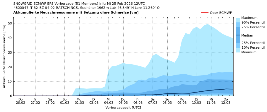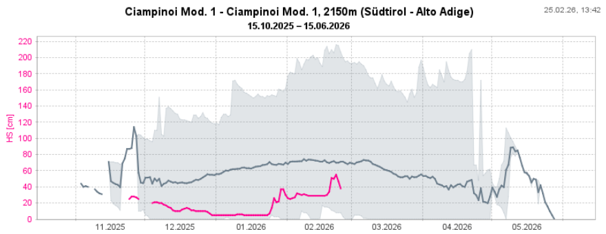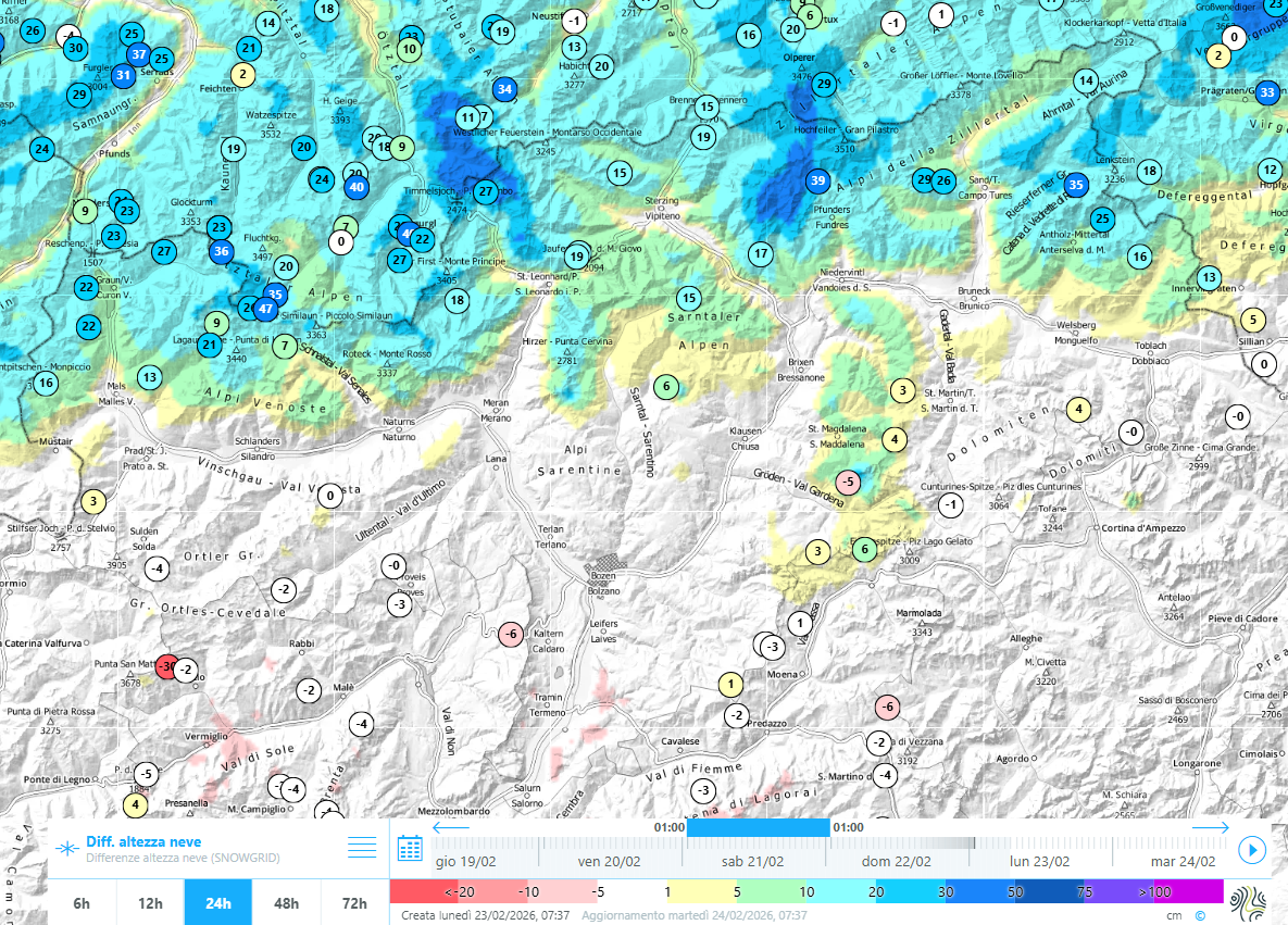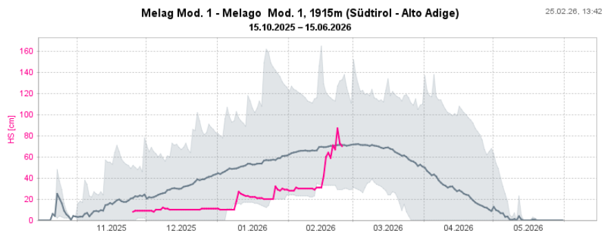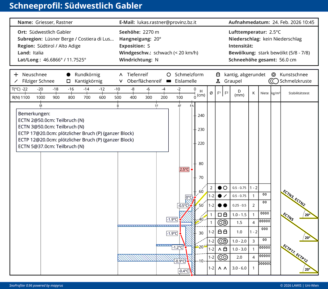 Darüber hinaus stieg die Nullgradgrenze ab dem Nachmittag des Sonntags, 22. Februar, auf über 2500 m, was an steilen sonnigen Hängen zur ersten Nassschneelawinenaktivität führte. Seit Mittwoch, 25. Februar, liegt die Nullgradgrenze bei über 3000 m.