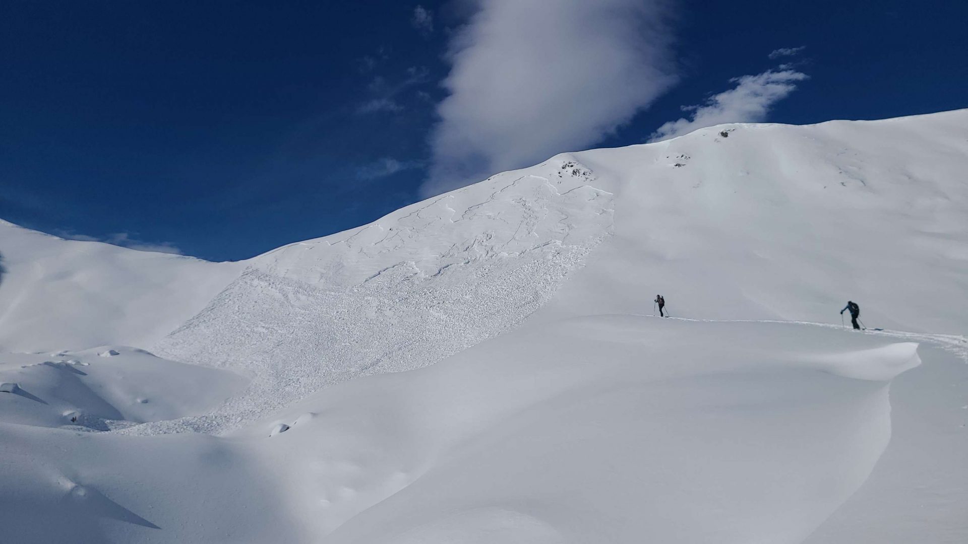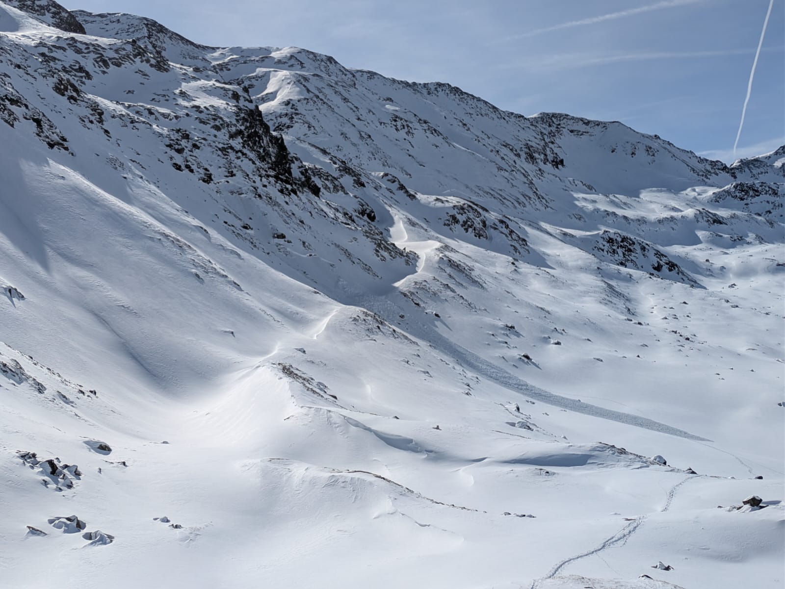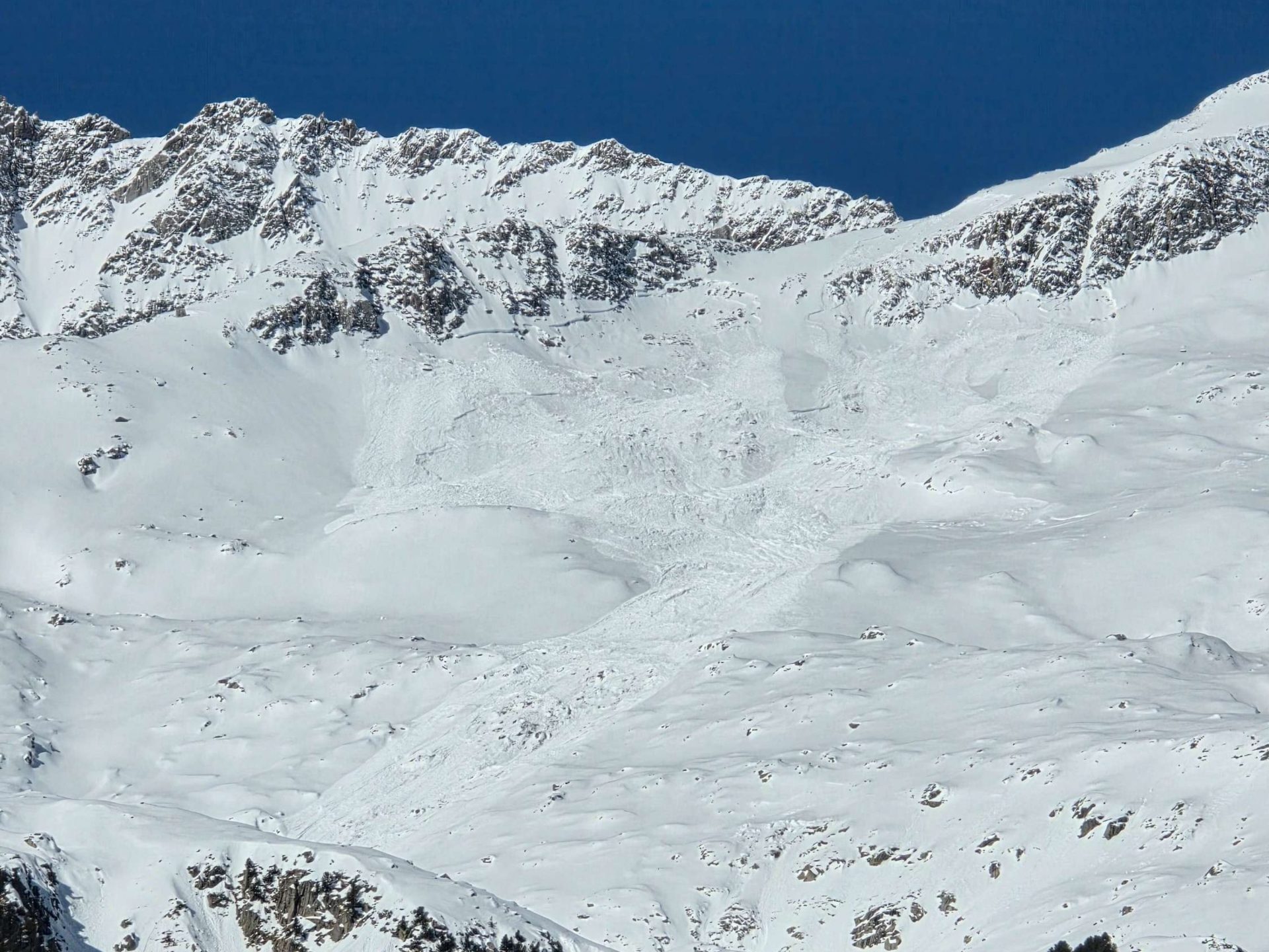 Es handelt sich um eine mittelgroße Lawine (Größe 2), die sich an einem Nordosthang auf ca. 2700 m mit einer Neigung zwischen 41° und 45° gelöst hat.