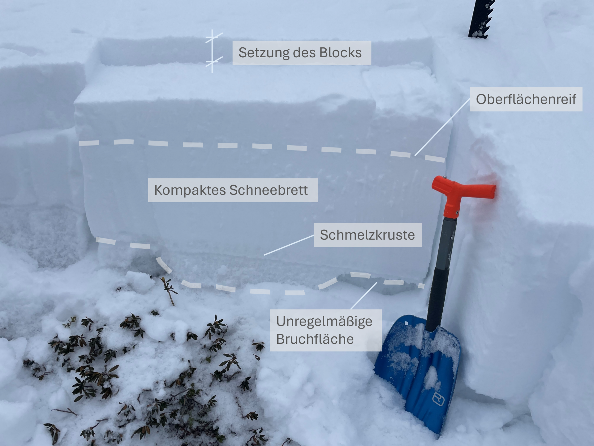 Bei einem Lokalaugenschein vor Ort wurde an der Anbruchkante der Lawine eine Schneedeckenuntersuchung durchgeführt: