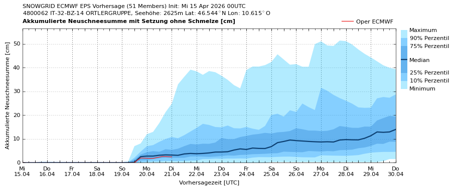 Am Sonntag, 19. April werden dann bis auf 2400 m Schneefälle erwartet. Anfang der nächsten Woche wird es wieder etwas frischer und die Nullgradgrenze sinkt auf 2000 m. Infolgedessen wird sich das Nassschneeproblem etwas beruhigen.