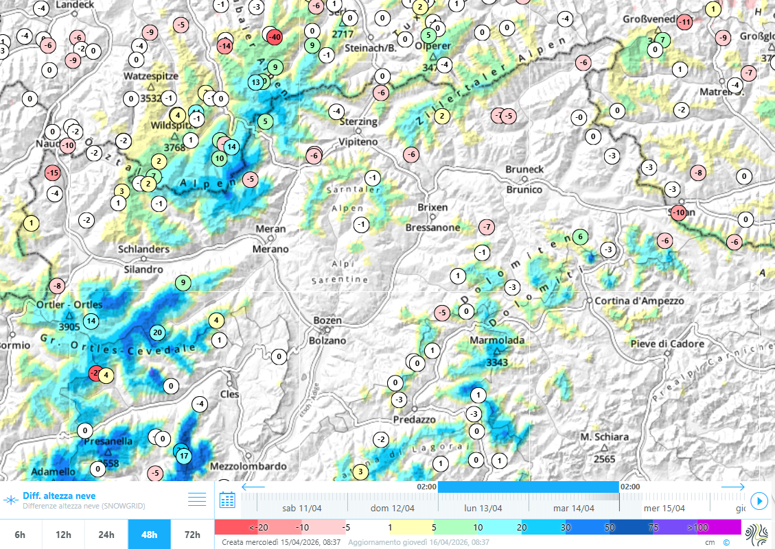 Seit Montag (13. April) hat eine südliche Anströmung besonders in den Südstaugebieten bis zu 20 cm Neuschnee gebracht, lokal im Ultental bis zu 30 cm. Begleitet war dieses Ereignis von mäßig bis starkem Südwind.