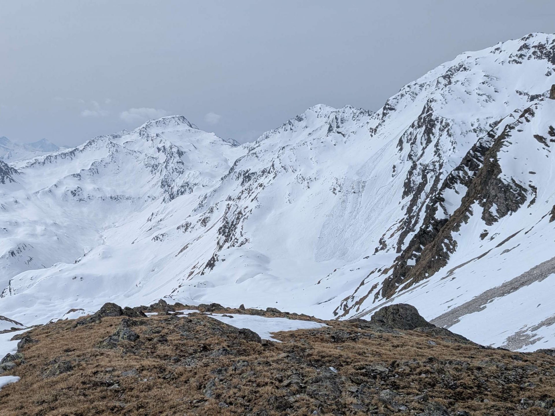Während der vergangenen Niederschläge hat es teilweise bis auf etwa 2500 m hinauf geregnet. Oberhalb konnten sich mit dem Wind frische, störanfällige Triebschneepakete bilden, unterhalb wurde die Schneedecke durch den Regen durchnässt und wir hatten es mit einem massiven Nassschneeproblem zu tun. Mit den milden Temperaturen und der hohen Luftfeuchte konnten sich die Triebschneepakete allerdings recht schnell stabilisieren.