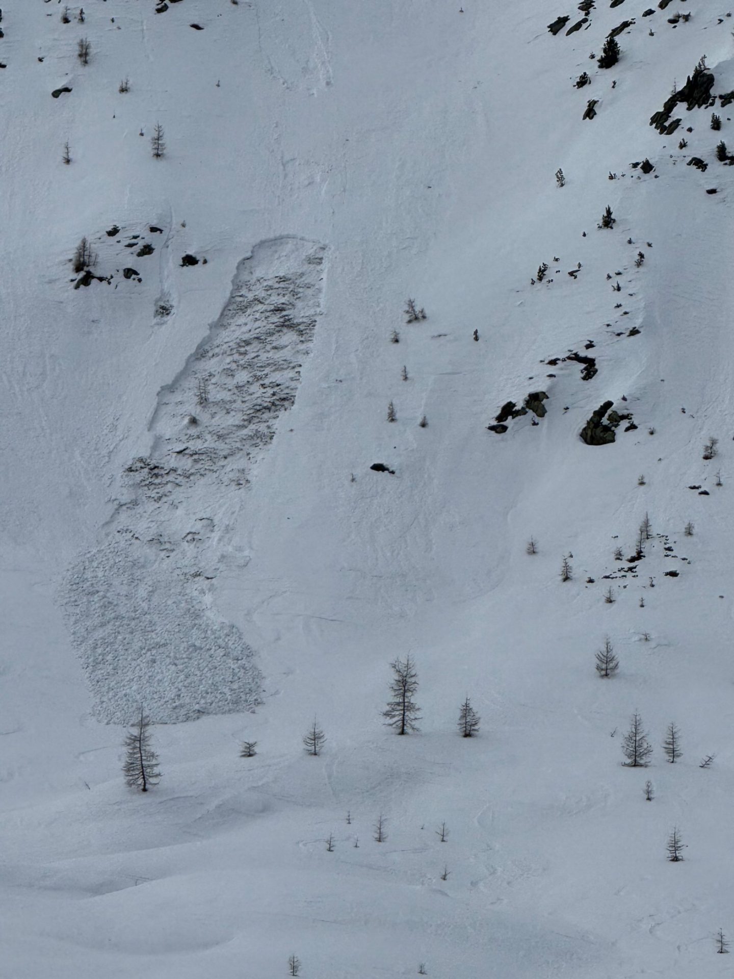 Es handelt sich um eine kleine (Größe 1), nasse Schneebrettlawine, die an einem Nordosthang auf ca. 2200 m in steilem Gelände (31° bis 35°) in der Basis der Schneedecke angebrochen war.